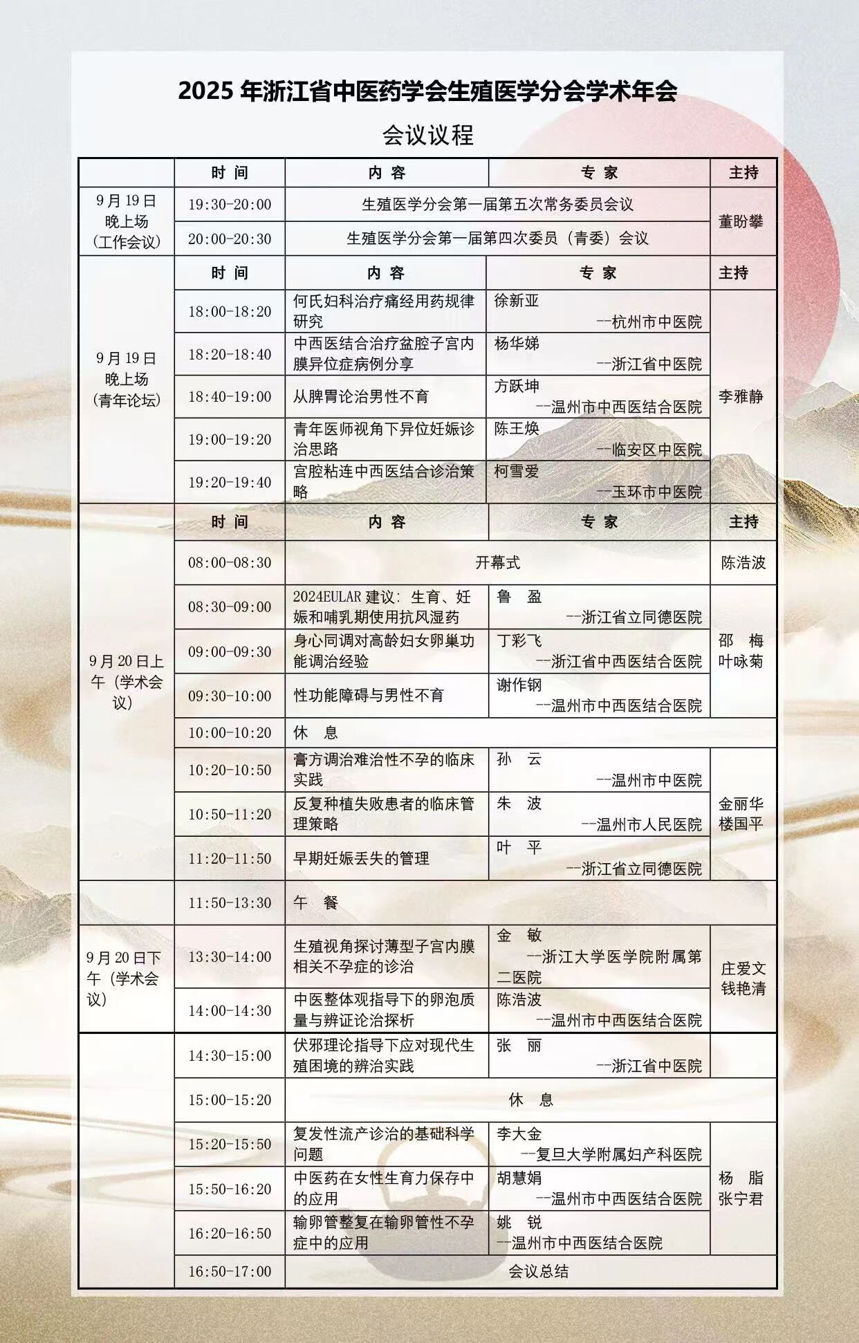 会议自9月19日晚开幕至20日全天,系统梳理了中医药在生殖健康领域的临床价值与科研进展。来自杭州市中医院、浙江省中医院、温州市中西医结合医院、浙江大学医学院附属第二医院及复旦大学附属妇产科医院等机构的专家,围绕“中医妇科疾病诊疗”“不孕不育中西医结合方案”“生殖抗衰机制研究”“辅助生殖技术中的中药干预”等议题展开分享。