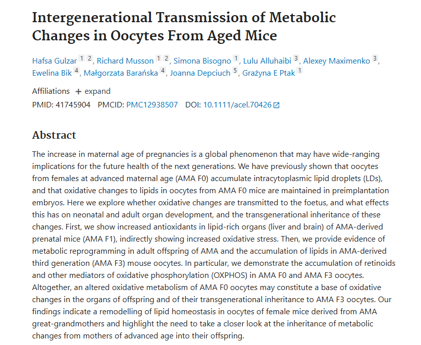 [1] Gulzar H, et al. Intergenerational transmission of metabolic changes in oocytes from aged mice. Aging Cell, 25(3), e70426.